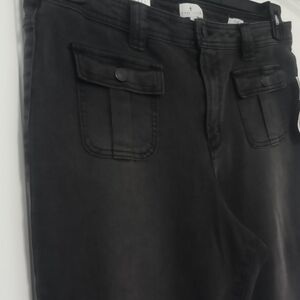 A washed black distressed pair of wide legs jean with flap pockets in front.