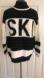Stylish knit sweater with bold 'SKI' lettering across the front chest. This mock turtleneck alternates black and white stripes.