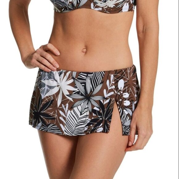 A variety of contrast leaves are printed all over the skirt and built-in hipster brief.