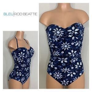 New. Bleu Rod Beattie blue strapless swimsuit. Retro-inspired meets modern in this cool swimsuit from Bleu by Rod Beattie, a bohemian printed one-piece accented by flattering front ruching and a removable strap for versatile styling.