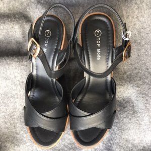 Brand new with tags, never worn! These sandals add major height with a sturdy block heel and platform. Black upper with an open toe, criss cross straps, and adjustable ankle strap. Women's size 7, originally purchased from Wet Seal.