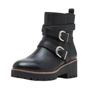 Sleek, modern styling. Luxe, textured tumbled leather. Cool moto-inspired straps and silvertone metal buckles. Thick platform lug sole for confident traction.