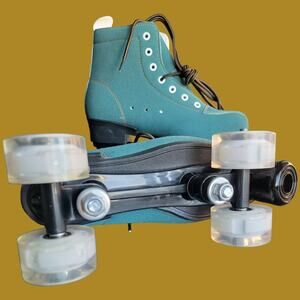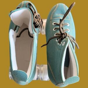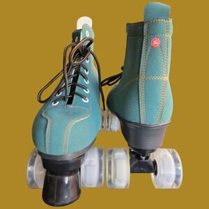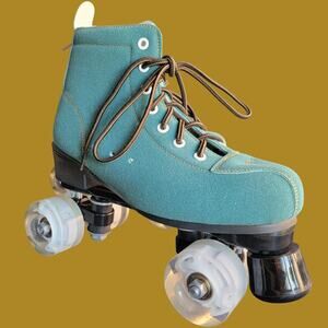 Never used quad high boot skates with dusty teal eco-suede uppers, gold contrast stitching, 14 islets with coordinated boot laces, black sole and clear PU wheels with LED "sparks" that are triggered by the wheels moving. The size EU 40/US 9 skates come in a blue and white vinyl bag with dust bags inside, and have a tightening tool and spare parts in the case.