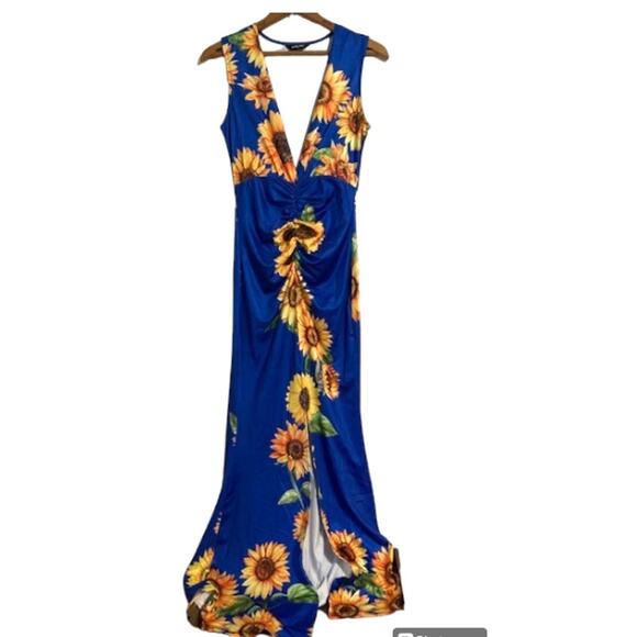 Royal blue dress with a large sunflower pattern in front and back. Sleeveless. Low cut neckline. Ruched waistline. Long slit at the bottom. New without tags. I bought this dress for myself but they accidentally sent me a size small instead. My loss is your gain!