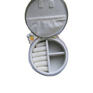 The New Blue & White Stripped Miami Beach Lemon Slice Summer Travel Jewelry Box Case is a stylish and practical accessory for those looking to organize and store their jewelry while on the go. Made from faux leather, this round jewelry box features a large capacity with removable dividers to customize the storage. The white color with blue and white stripes gives it a modern and chic look, perfect for both men and women. The lemon slice design adds a fun and vibrant touch, making it an ideal choice for summer travels. This portable jewelry box is both fashionable and functional, ideal for keeping your favorite pieces safe and secure while you're out exploring the world.