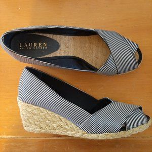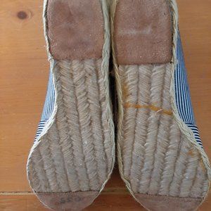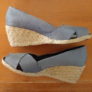 The shoes are perfect for summer. They are brand new, never worn. They have no tags. They are a size 8b. The wedgies have hemp rope coverings. The height is 3"s. The cotton fabric is a durable unknown fabric. The crossover, open toe style is perfect for summer. This is a great buy!