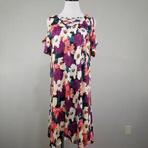 NEW BLUETIME JERSEY KNIT FLORAL PRINT COLD SHOULDER A LINE DRESS