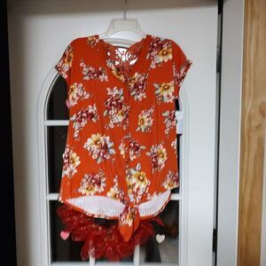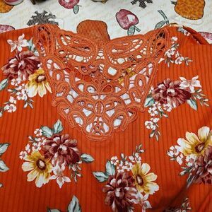 New with tag bobbie brooks crochet back tie front top size women's L. It is orange with flowers 19 inches across and 26 inches long.