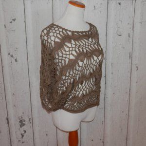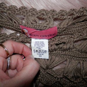 Up for sale is a Brand New With Tags Body Central Size Small/Medium brown very open loose knitted braided pull over shirt. Short batwing sleeve. Semi-crop. Boho style. Stretch. 100% Cotton.