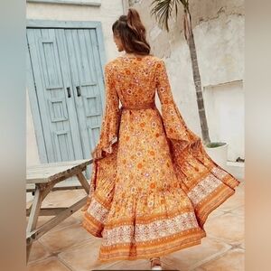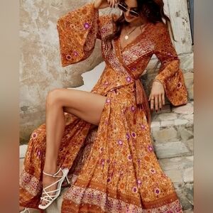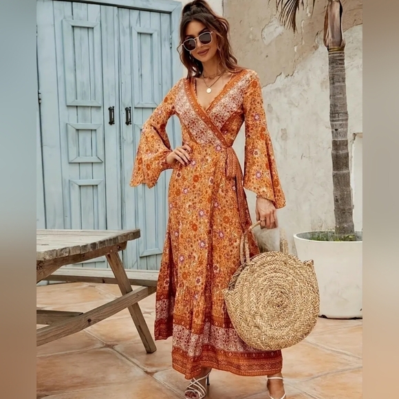 Embrace bohemian style with this stunning orange floral maxi dress. Perfect for any occasion, this dress features a flattering wrap design and elegant bell sleeves.