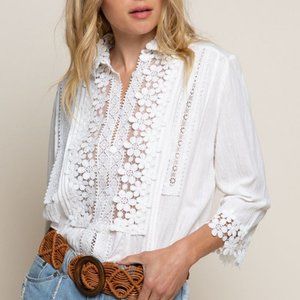 Bestseller!! Darling white lace base, slight mock neck with and button front.
