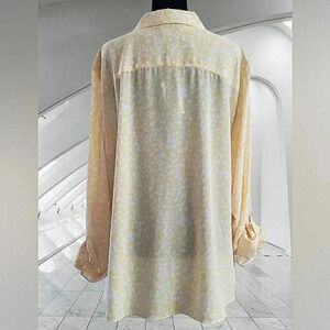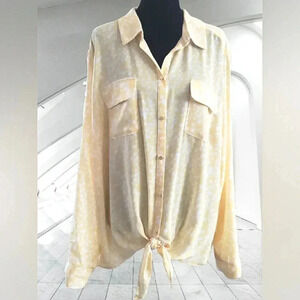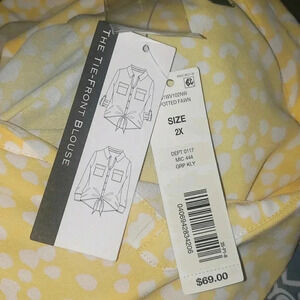 New With Tags Absolutely Stunning Women's Plussize 2XL Yellow And White Spots Tie Front Coastal Roll Sleeve Lightweight Sheer Resort Cruise Vacation Versatile Supersoft Wedding Guest Garden Party Career Office Casual Sexy Packable Travel Easter Fall Winter Business Casual Packable Washable