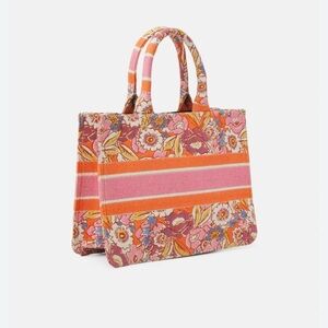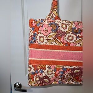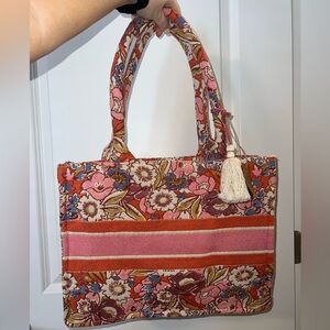 This Boho Floral Woven Tote Bag is a stylish and functional statement piece! Featuring a vibrant floral tapestry design in warm hues of pink, orange, and cream, this tote is perfect for everyday use, beach trips, or weekend getaways. The sturdy woven fabric adds a vintage-inspired touch, while the padded handles ensure comfort when carrying. Finished with a boho-chic tassel detail and a leather accent tag, this bag is both practical and fashionable. Gently used and in excellent condition. A must-have for any free-spirited wardrobe!