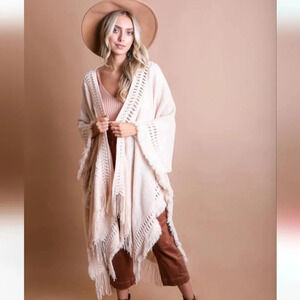 New Boho Fringe Knit Ruana Wrap Kimono Cream
