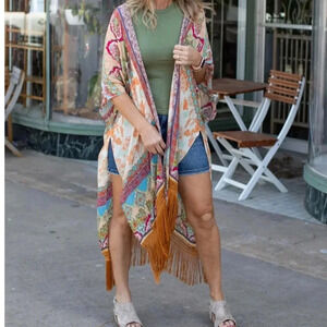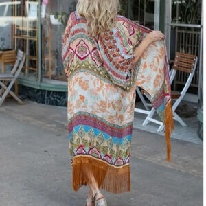 New! Boho Jaquard Print Fringe Kimono Coverup Wrap