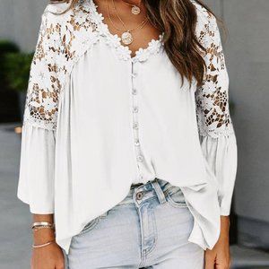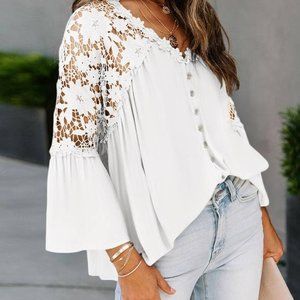 New Boho White Lace Flare Sleeve Button Front Blouse