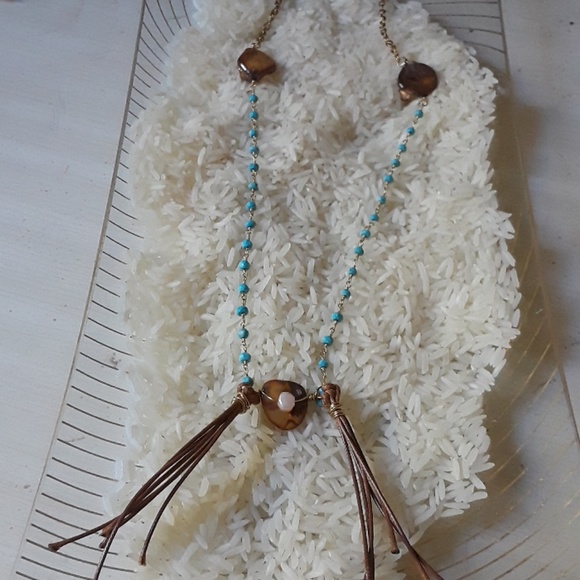 Animal friendly Non leather tassles and a pink pearl wire wrapped around a shell. The shells and turquoise colored stones accent the necklace. And the necklace is 18". Handmade by myself. Buy one give 10% to charity.
