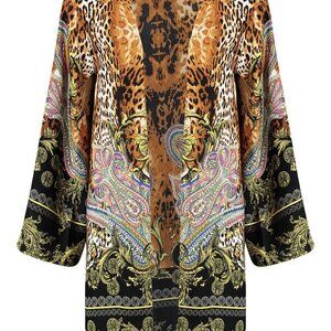 Stylish kimono with a bold animal print and paisley design. Perfect for layering.