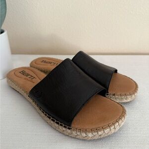 Chic black leather slides with espadrille soles. Effortless style and comfort.