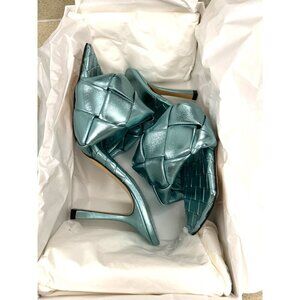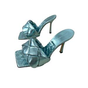 Elegant metallic heeled mules offering a bold quilted design and striking aqua blue tone, ideal for sophisticated and fashionable styling.