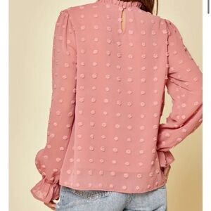 Brand new with tags. Mauve pink blouse with pompom detail and ruffled collar and sleeves. Adorable flirty and feminine style. Body lined, sleeves are sheer. Keyhole closure in back. Please see photos for additional details.