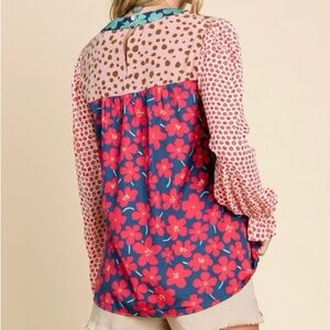 🔥🔥New Boutique Mixed Print Poet Sleeve Top With U-neck /back Button Size Large