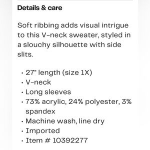 NWT brand new! Designer. More info in photos. Measurements of 1X and 2X in photos. Stay warm and stylish with this cozy gray V-neck sweater. Perfect for any casual outing. Lightweight. Vertical ribbing. Small side splits. Soft. Smoke free home