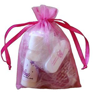 Set Includes Pink Mesh Draw String Bag, Vanilla Hand & Body Lotion, Icy Hot Pink Gel Pack, Gray, Teal & Pink Collapsible Emery Board