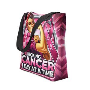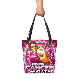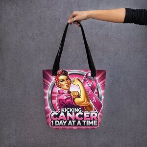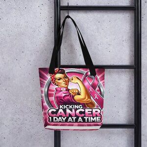 Kickin' cancer's butt—one fierce, fashion-forward day at a time. This isn't just a tote, it's a battle cry in bold print. With street-tough energy and survivor swagger, it's for the fighters, the supporters, and the "you picked the wrong body" kind of warriors.