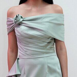 A romantic satin gown that exudes understated sophistication. The straight-across neckline and off-shoulder design create a graceful silhouette, while the gathered waistline and delicate rosette details add a poetic charm. Finished with a soft ruffle and leg slit, it perfectly balances elegance and allure.