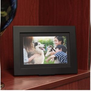 Brookstone 8-inch espresso WiFi photo frame. Instantly send photos from phone to frame. HD touchscreen display.