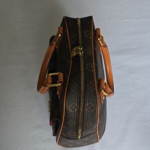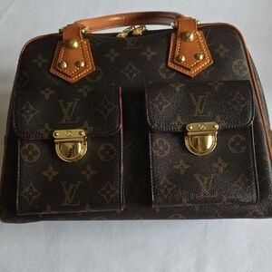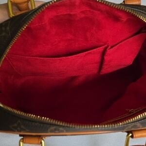 Very chic brown and tan monogrammed top handle bag, featuring dual front pockets and gold-tone hardware. Inside pockets and zipper closure. Gorgeous red interior. Mint condition!