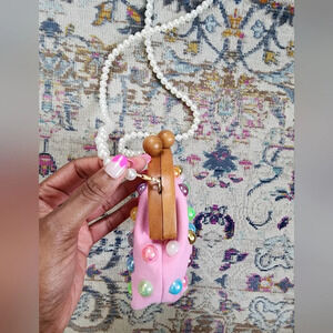 New, Bubble Gum Studded Pink, Wooden Closure, Clutch/Pearl Strap Purse