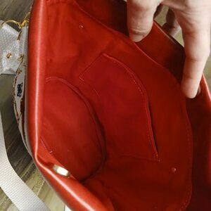 New Bucket Saddle Bag Purse Tote Red White Cow Bulls Southwestern print Pleather
