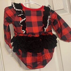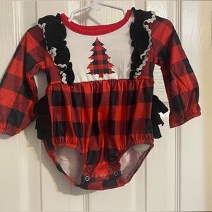 New Buffalo Plaid Holiday Romper Long sleeve bubble romper Christmas tree on front Ruffle butt romper Smoke feee home