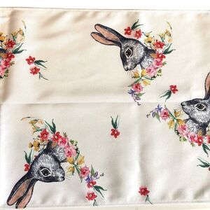 New! Bunny Rabbit Easter Long Table Runner Rectangular Hare Bunny Head in Colorful Flowers Pink Green Purple Yellow on a White Background Quality Fabric Dinner Table Sofa Table Counter Top One Sided Print NWOT Condition!