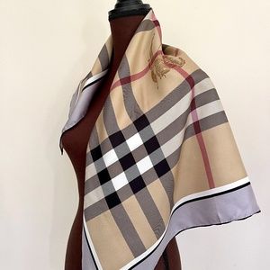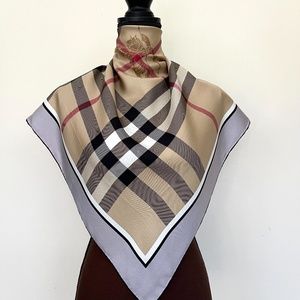 Authentic Burberry Beige Check Gray Border Silk Scarf