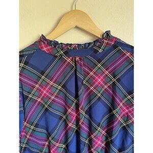 New! CATO Size Xl Blue Pink Berry Plaid Ruffle Neck Tie Waist Sheer Long Sleeve