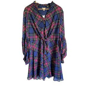 New! CATO Size Xl Blue Pink Berry Plaid Ruffle Neck Tie Waist Sheer Long Sleeve A-Line Dress MSRP $34.99