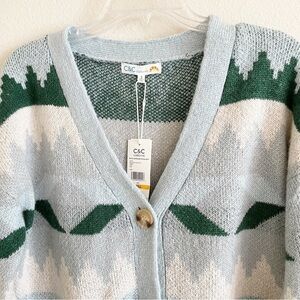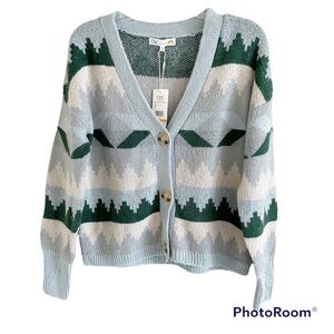 New C&C CALIFORNIA Aztec Print Oversized Cropped Cardigan V Neck Blue Sweater S