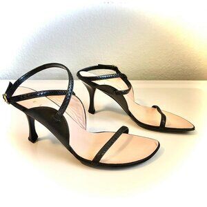 Beautiful Rare Style Celine Designer Heeled Sandals with black embossed leather straps one across the vamp and an adjustable ankle wrap strap with gorgeous gold metal buckles and a 3.5"H triangle shaped heel...
