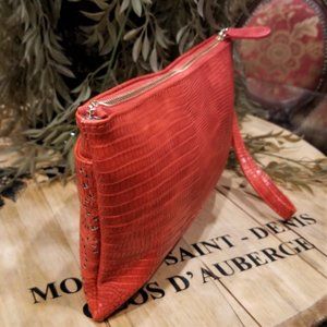 New CHICO's Pippa Perforated Medallion Reptile Embossed Clutch in a Rich Burnt Orange Color ~ New without Tags, Never Used ~ Removable Wrist Strap ~ Polished Gold Tone Hardware & Zipper ~ This Piece is Definitely Packs a Punch & will Accommodate any Outfit from Jeans and a T to any Business Attire ~ Cotton Reptile Print Interior ~ Front Snap Closure Pocket for Cell, Keys, Etc. ~ Interior Zipper Closure Side Pocket ~ Approx. 10.5" Long by 6.75" High ~ All Sales Final on Purses.
