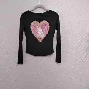 This adorable black long sleeve shirt features a charming bunny heart design, perfect for adding a touch of whimsy to your child's wardrobe.