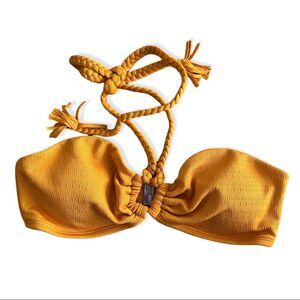 Hit the beach in this stunning Yellow Braided Halter Bikini. The bikini top features a braided halter design with back hook closure. Matching bottoms is a low-rise bikini bottom detailed with square ring at the sides.