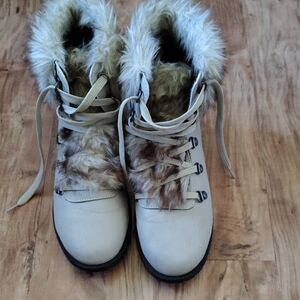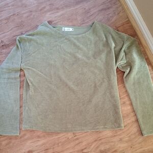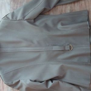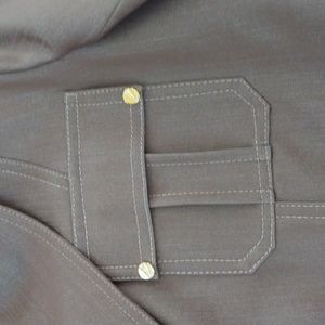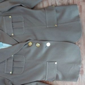 This beautiful jacket is classy and can dress up jeans, skirts or shorts. Jacket is fully lined in satin and features detailed trim and gold buttons and studs. Optional tie belt can be worn through decorative loop at back ( see photos). Rich taupe color is very versatile, flattering. chest 21" length 24" sleeves 24"