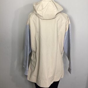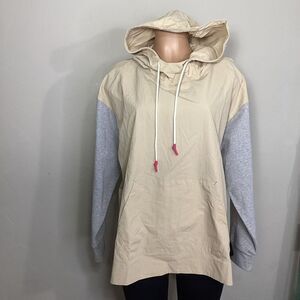 New. Calme by Johnny Was mix nylon hooded pullover jacket. Perfect for a windy day or one with light rain. Comfortable jersey sleeve and nylon body. Kangaroo pouch in front. Hooded. Split on the sides for comfort. Love this!