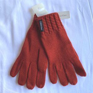 This is a new-with-tags pair of Calvin Klein gloves in a thick, soft rust-red knit. Composition: 100 percent acrylic. Smoke-free home.