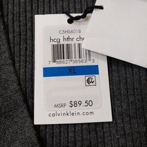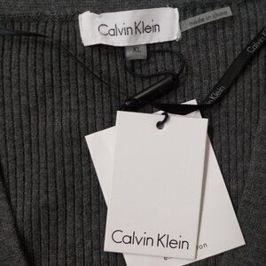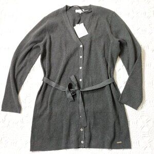 New Calvin Klein Cardigan Sweater Gray Button Up Front, V Neck, Belted, Ribbed Knit with Hip Length XL Women