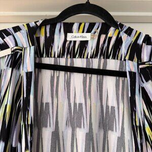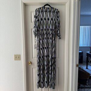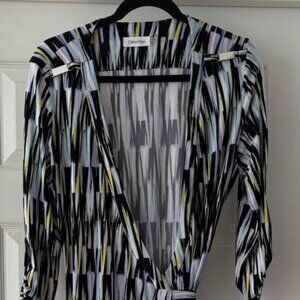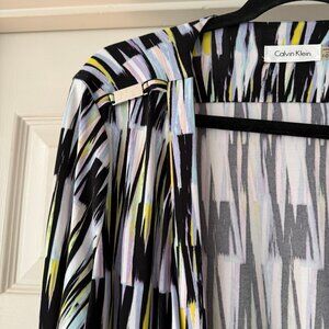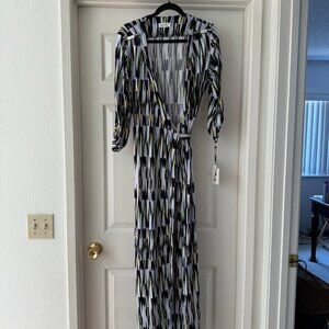 New Calvin Klein Long Wrap Dress - Beautiful Abstract Print (Blue/lavender, White, Green/Yellow, Black) Silver metal details. The sleeves are the perfect 3/4's. Easy to wear. Great year-round dress to style casually or more formally - perfect for travel.