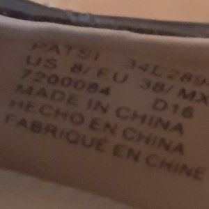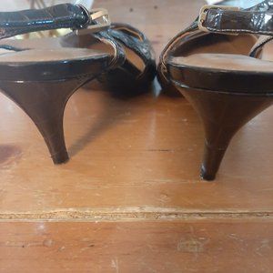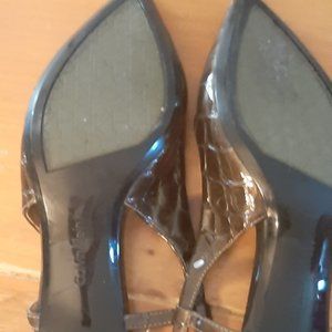 The pumps are patent leather and the soles are made of a man made material. They are a size 8. They are new, never used. The heel is 2"s in height.